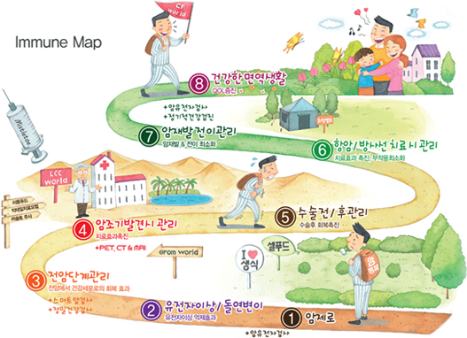 [암예방&면역치료 로드맵]에는 전암단계부터 암발병단계, 암재발 전이 관리단계를 거쳐 건강한