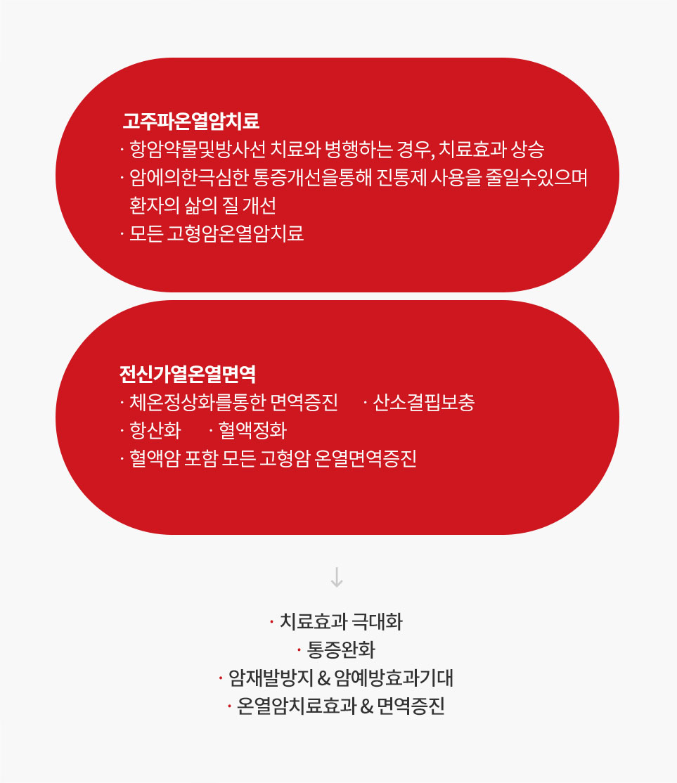 국소부위의 암치료효과증대를 위한 고주파온열암치료와 원적외선 온열치료를 통한 전신가열온열요법의 통합치료를 실시하고 있습니다.